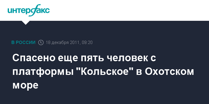 Южно-Сахалинск. 18 декабря. INTERFAX.RU - В Охотском море из воды поднято еще пять живых человек с перевернувшейся платформы "Кольское" в Охотском море.