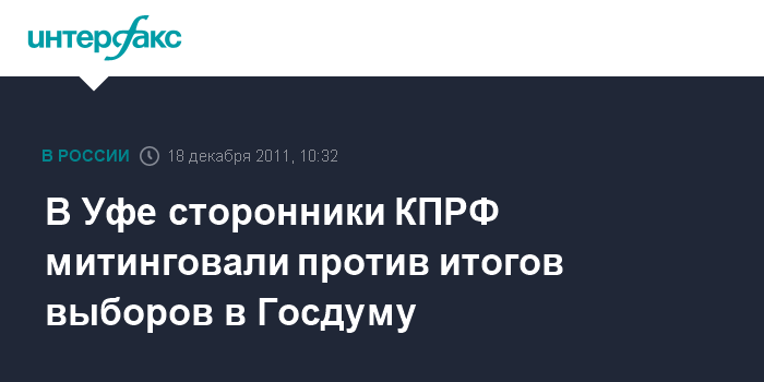 Уфа. 18 декабря. INTERFAX.RU - Башкирские коммунисты провели в воскресенье в Уфе митинг против "массовых фальсификаций" 4 декабря на выборах в Госдуму. Несмотря на мороз минус 15 градусов, на площади перед Русским драматическим театром собрались, по данным организаторов, 250 человек. По данным полиции, на мероприятии присутствовало до 50 человек, в основном люди среднего и пожилого возраста.