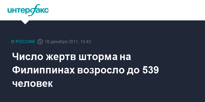 Джакарта. 18 декабря. INTERFAX.RU - Обрушившийся на Филиппины тропический шторм "Ваши" унес жизни не менее 539 человек, еще 274 считаются пропавшими без вести, сообщает в воскресенье агентство ЭФЭ со ссылкой на данные Красного Креста.