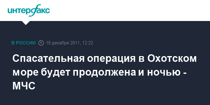 Москва. 18 декабря. INTERFAX.RU - Спасательная операция Охотском море, где затонула плавучая буровая платформа "Кольская", не приостанавливалась и будет продолжена с наступлением темноты, заявляют в МЧС России. "Спасательная операция будет продолжена, несмотря на наступление темного времени суток", - сказали "Интерфаксу" в управлении информации МЧС России в воскресенье.