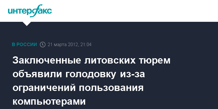Вильнюс. 21 марта. INTERFAX.RU - В знак протеста против введенных ограничений на пользование компьютерами в тюрьмах Литвы более 2,3 тыс. заключенных и арестованных в разных городах республики объявили голодовку, сообщает в среду Департамент по делам тюрем.
