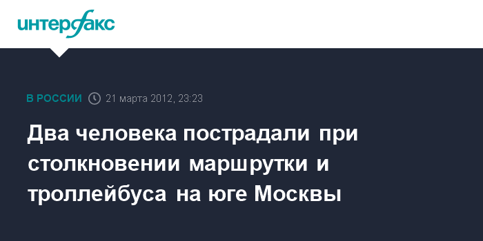Москва. 21 марта. INTERFAX.RU - Два человека пострадали в результате столкновения маршрутного такси и троллейбуса на Каширском шоссе в Москве, сообщил "Интерфаксу" источник в правоохранительных органах. По его словам, ДТП произошло у дома 76.