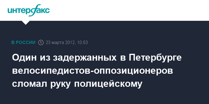 Санкт-Петербург. 23 марта. INTERFAX.RU - Участник оппозиционного велопробега в Петербурге накануне вечером сломал руку полицейскому, сообщил "Интерфаксу" в пятницу источник в правоохранительных органах.