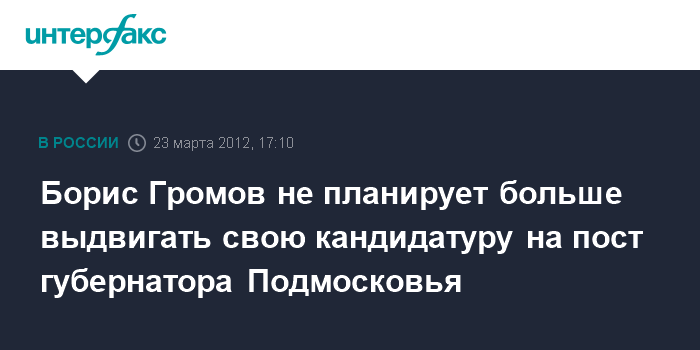 Москва. 23 марта. INTERFAX.RU - Губернатор Московской области Борис Громов принял решение обратиться в высший совет партии "Единая Россия" с просьбой не рассматривать его в качестве одного из кандидатов на пост губернатора региона на следующий период, сообщает пресс-служба Громова в пятницу.