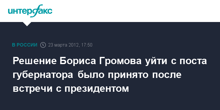 Москва. 23 марта. INTERFAX.RU - Губернатор Московской области Борис Громов принял решение покинуть свой пост после встречи с главой государства, сообщил "Интерфаксу" источник в окружении губернатора.