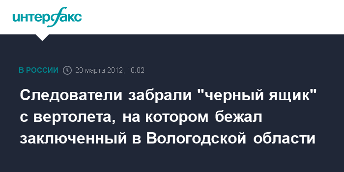 Вологда. 23 марта. INTERFAX.RU - Следователи изъяли "черный ящик" и другие предметы из вертолета, который заключенный в Вологодской области использовал для побега, сообщила "Интерфаксу" сотрудник пресс-службы областного следственного управления Наталья Летенкова.