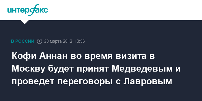 Москва. 23 марта. INTERFAX.RU - Спецпосланник ООН/ЛАГ по Сирии Кофи Аннан, визит которого по приглашению российской стороны пройдет 25 марта, будет принят президентом РФ Дмитрием Медведевым, запланирована его беседа с министром иностранных дел Сергеем Лавровым, сообщает в пятницу МИД РФ.