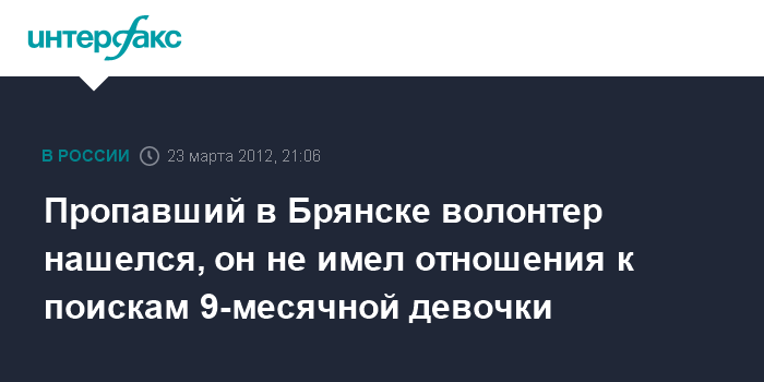 Москва. 23 марта. INTERFAX.RU - В работающем в Брянске поисковом отряде отрицают причастность пропавшего по некоторым данным волонтера Сергея Фетисова к поискам ребенка.