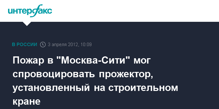 Москва. 3 апреля. INTERFAX.RU - Пожар на башне в "Москва-Сити" мог вызвать прожектор на строительном кране, сообщили "Интерфаксу" в пресс-службе ГУ МЧС России по Москве.