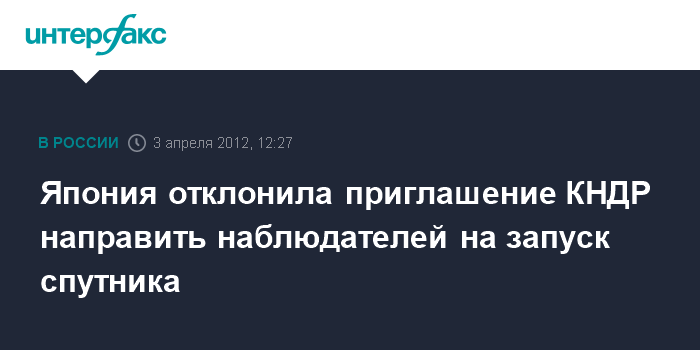 Токио. 3 апреля. INTERFAX.RU - Япония отказалась посылать наблюдателей в КНДР на запуск ракеты, которая должна вывести на околоземную орбиту искусственный спутник, заявил во вторник представитель японского кабинета министров Осуму Фудзимура.