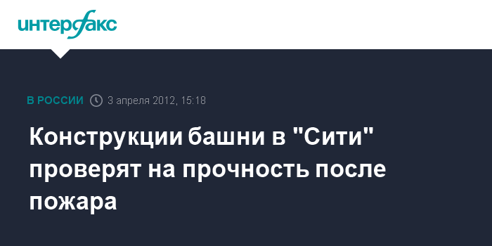 Москва. 3 апреля. INTERFAX.RU - Мосгосстройнадзор проверит прочность конструкций на горевших этажах в высотке делового центра "Москва-Сити", сообщил "Интерфаксу" во вторник источник в городской администрации.