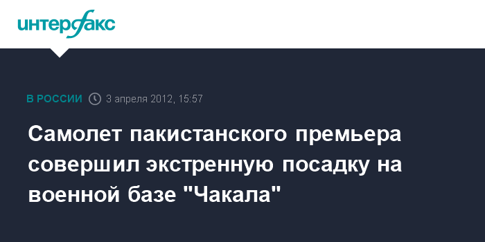 Исламабад. 3 апреля. INTERFAX.Ru - Самолет главы правительства Пакистана Юсуфа Резы Гилани совершил экстренную посадку на военной базе "Чакала" близ пакистанского города Равалпинди, сообщает сайт пакистанской газеты Pakistan Today.