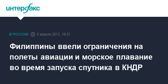 Дубай. 3 апреля. INTERFAX.RU - Филиппинские власти из соображений безопасности запретили плавания судов и полеты самолетов в восточной части страны с 12 по 16 апреля, когда КНДР планирует запуск спутника, сообщил во вторник сайт издающейся в Дубае англоязычной газеты "Галф ньюс".