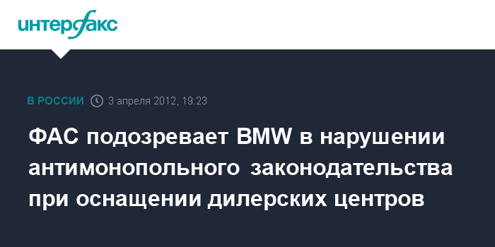 Москва. 3 апреля. INTERFAX.RU - Федеральная антимонопольная служба (ФАС) РФ возбудила дела в отношении ООО "БМВ Русланд Трейдинг" (подразделение германского автопроизводителя Bayerische Motoren Werke (BMW) в России) и ООО "ТД "Эквинет" по признакам нарушения закона "О защите конкуренции".