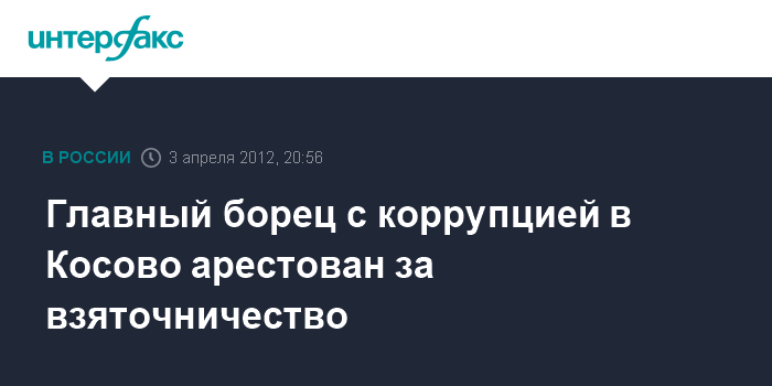 Белград. 3 апреля. INTERFAX.RU - Глава службы по борьбе с коррупцией Косово Назми Мустафи арестован по обвинению в коррупционной деятельности и превышении полномочий, объявили во вторник местные власти. По данным прокуратуры Косово, Мустафи обвиняется в том, что вымогал взятки у людей, которые сами подозревались в коррупции и находились под следствием.