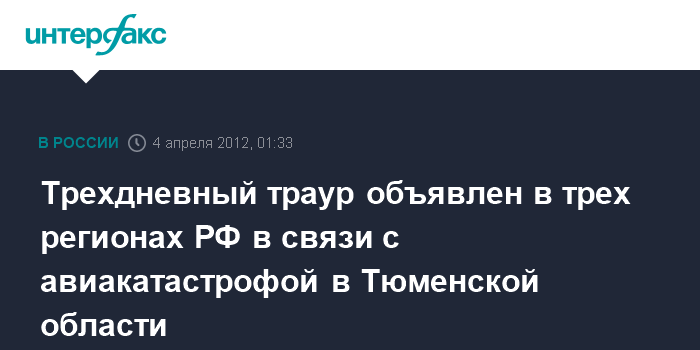 Трехдневный траур объявлен в трех регионах РФ в связи с авиакатастрофой в Тюменской области
