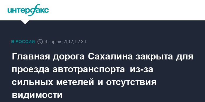 Южно-Сахалинск. 4 апреля. ИНТЕРФАКС-ДАЛЬНИЙ ВОСТОК - Главная дорога Сахалина, связывающая юг с северной его частью, закрыта утром в четверг для проезда автотранспорта от Южно-Сахалинска до Поронайского района (центральная часть Сахалина - ИФ) из-за метелей и отсутствия видимости, сообщили агентству "Интерфакс - Дальни Восток" в управлении автомобильных дорог Сахалинской области (Сахалинавтодор).