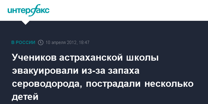 Москва. 10 апреля. INTERFAX.RU - Волжское межрегиональное природоохранное следственное управление СКР проводит доследственную проверку по факту отравления неустановленными газами учащихся средней школы села Сеитовка Красноярского района Астраханской области. "Установлено, что во вторник около 9 часов утра учителя и учащиеся школы почувствовали острый запах сероводорода, в связи с чем дети были вывезены за пределы села",- говорится в сообщении на сайте СК РФ.