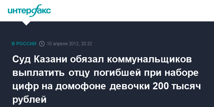 Казань. 10 апреля. INTERFAX.RU - Авиастроительный районный суд Казани во вторник постановил взыскать с районной управляющей компании ЖКХ 200 тыс. рублей отцу 13-летней Ирины Сорокиной, которая в июле 2007 г. получила смертельный удар током после того, как набрала номер на домофоне дома.