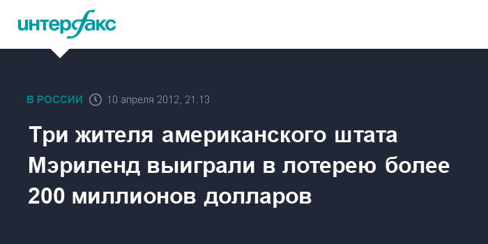 Три жителя американского штата Мэриленд выиграли в лотерею более 200 миллионов долларов