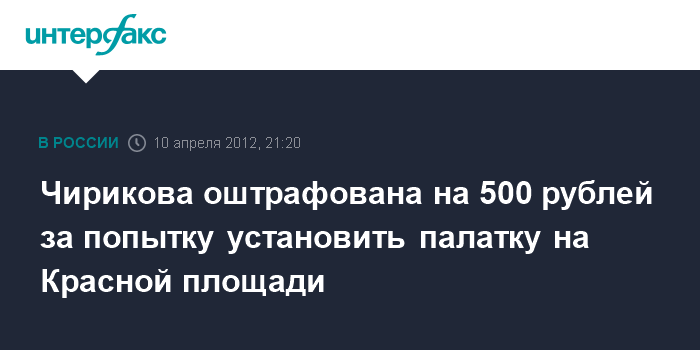 Москва. 10 апреля. INTERFAX.RU - Мировой участок Тверского суда Москвы назначил наказание в виде штрафа в 500 рублей лидеру движения "В защиту Химкинского леса" Евгении Чириковой, задержанной в минувшее воскресенье на Красной площади при попытке установить палатку. Как передает корреспондент "Интерфакса", Чирикову признали виновной в нарушении статьи 19.3 КоАП РФ ("Неповиновение законным требованиям сотрудников полиции").