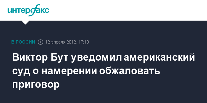 Москва. 12 апреля. INTERFAX.RU - Адвокаты российского бизнесмена Виктора Бута, которому в США назначили наказание в виде 25 лет заключения по делу о торговле оружием, направили в суд в Нью-Йорке заявление о намерении обжаловать приговор, сообщил защитник предпринимателя Альберт Даян в ходе видео-моста с Москвой.