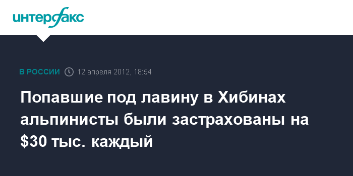 Санкт-Петербург. 12 апреля. INTERFAX.RU - Все альпинисты клуба "Политехник", попавшие под сход лавины в Хибинах, были застрахованы на $30 тыс. каждый, сообщает пресс-служба страховой компании "Альянс".
