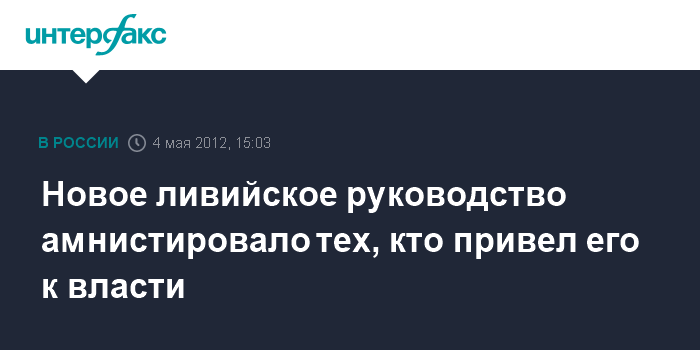 Лондон. 4 мая. INTERFAX.RU - Правящий в Ливии Национальный переходный совет освободил от уголовного преследования всех, кто боролся за свержение режима Муамара Каддафи. "Не будет никакого наказания за действия, которые были продиктованы революцией 17 февраля", - говорится в заявлении совета, которое цитирует в пятницу газета Guardian.