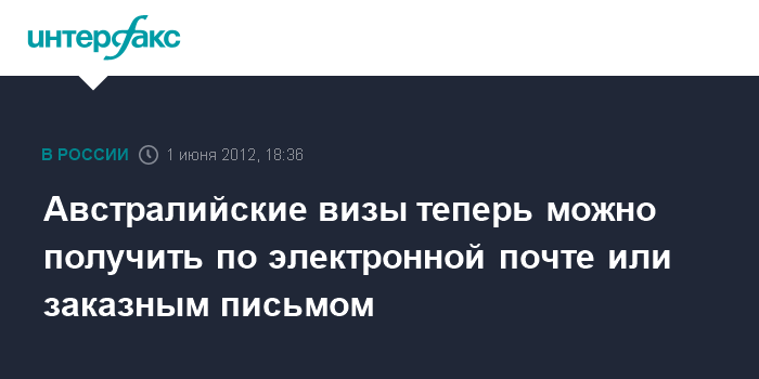 Москва. 1 июня. INTERFAX.RU - Россияне с 1 июня смогут получать австралийские визы по электронной почте. "По информации посольства Австралии в Москве, с 1 июня 2012 года российским гражданам при положительном решении о выдаче австралийских виз, как правило, не будут вклеиваться в паспорта визовые талоны, а будут направляться уведомления по электронной почте или заказным письмом", - говорится в сообщении МИД РФ, распространенном в пятницу.