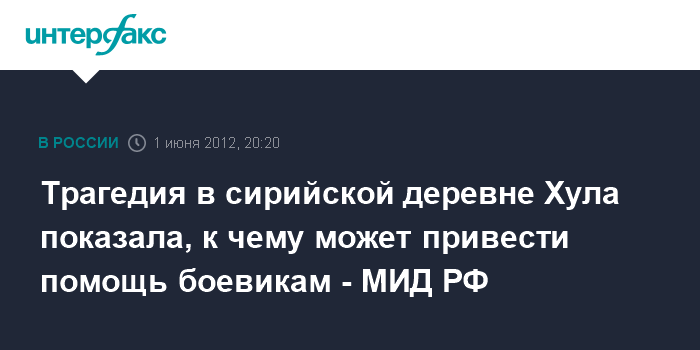 Москва. 1 июня. INTERFAX.RU - Трагедия в сирийском населенном пункте Хула продемонстрировала всю опасность заигрывания с экстремистами, заявляют в Москве. "Трагедия в Хуле показала, к чему может привести финансовая помощь и поставки контрабандным путем современных видов вооружений боевикам, вербовка иностранных наемников и заигрывание с разного рода экстремистами", - говорится в комментарии официального представителя МИД РФ Александра Лукашевича, текст которого размещен вечером в пятницу на сайте ведомства.