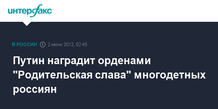Москва. 2 июня. ИНТЕРФАКС - Президент России Владимир Путин второго июня в Большом Кремлевском дворце вручит многодетным семьям ордена "Родительская слава".