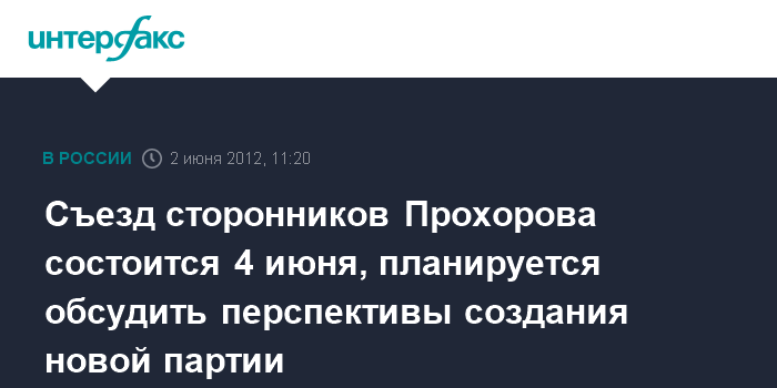 Москва. 2 июня. INTERFAX.RU - Экс-кандидат в президенты РФ, миллиардер Михаил Прохоров намерен создать партию, аналогов которой в России еще не было, сообщает сайт тележурналиста Александра Любимова, который является членом команды бизнесмена. По словам А.Любимова, съезд сторонников М.Прохорова планируется провести 4 июня.