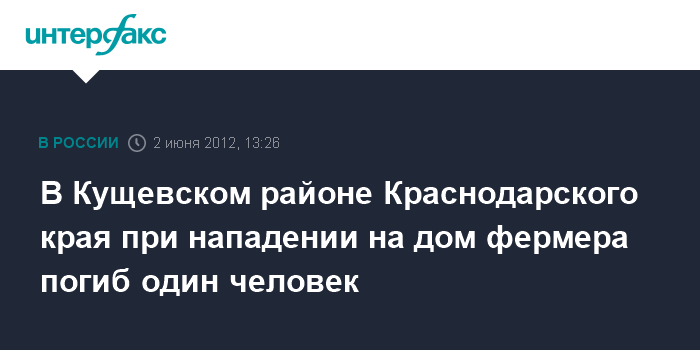 Краснодар. 2 июня. INTERFAX.RU - В Кущевском районе Краснодарского края совершено разбойное нападение на дом фермера, погиб один человек, сообщила в субботу пресс-служба прокуратуры региона. "Сегодня в 7:30 по Москве в Кущевском районе в селе Раздольное совершено разбойное нападение на дом фермера. В результате нападения один человек погиб. Нападавшие с места происшествия скрылись", - говорится в сообщении.