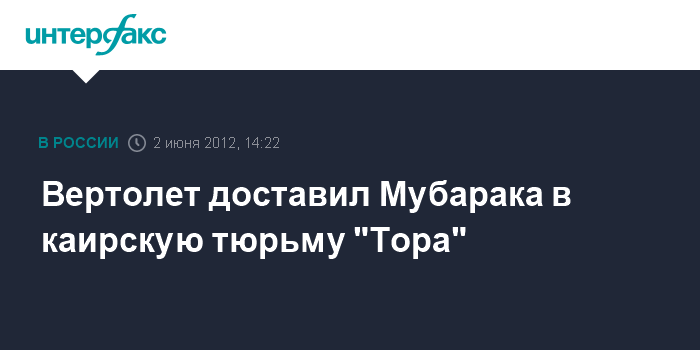 Каир. 2 июня. INTERFAX.RU - Бывший президент Египта Хосни Мубарак после оглашения приговора суда в субботу днем был доставлен вертолетом в каирскую тюрьму "Тора", где будет отбывать пожизненное заключение, сообщило местное телевидение. В тюрьме ранее содержались бывшие должностные лица Египта, которые обвинялись в том, что отдали приказ стрелять по демонстрантам в ходе гражданских волнений в Египте в прошлом году.