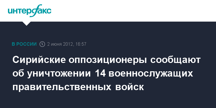 Лондон. 2 июня. INTERFAX.RU - Отряды сирийских оппозиционеров в субботу убили шесть военнослужащих правительственных войск в провинции Дераа на юге Сирии и еще восемь - в пригородах Дамаска, сообщил базирующийся в Лондоне Сирийский наблюдательный совет по правам человека. "(В провинции Дераа - ИФ) произошли ожесточенные столкновения между сирийскими войсками и оппозицией, в результате которых погибли шесть военнослужащих, - говорится в сообщении. - На рассвете были ожесточенные бои в аль-Гуте (под Дамаском - ИФ), в ходе которых были убиты шесть сирийских военнослужащих".