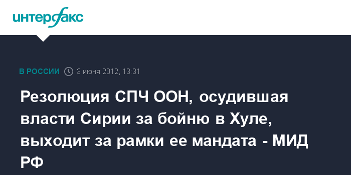 Как сообщалось, 1 июня в Женеве по инициативе группы западных стран была созвана очередная специальная сессия Совета ООН по правам человека в связи с недавними трагическими событиями в сирийском городе Хула. По ее итогам была принята резолюция, осуждающая исключительно правительство Сирии за произошедшее.