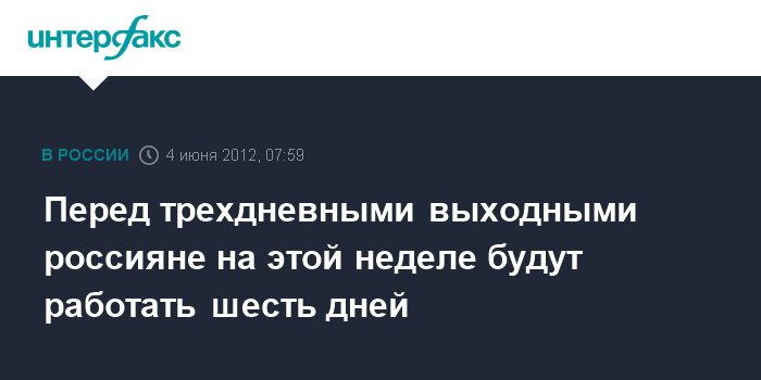 Москва. 4 июня. INTERFAX.RU - У россиян на текущей неделе будет шесть рабочих дней в связи с переносом выходных перед празднованием Дня России, сообщили "Интерфаксу" в Федеральной службе по труду и занятости. "Наступившая рабочая неделя станет шестидневной, поскольку суббота, 9 июня - рабочий день. Согласно Трудовому кодексу РФ, выходной день с 9 числа переносится на понедельник, 11-ое. Таким образом, к празднованию Дня России будет три выходных дня подряд - 10, 11 июня и сам праздник 12 июня", - сообщили в Роструде.