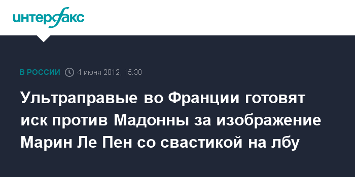 Париж. 4 мая. INTERFAX.RU - Ультраправая французская партия "Национальный фронт" подаст иск против певицы Мадонны в случае воспроизведения на ее концерте в Париже видео с изображением лидера партии Марин Ле Пен со свастикой на лбу, сообщил в понедельник вице-президент партии Луи Альо.