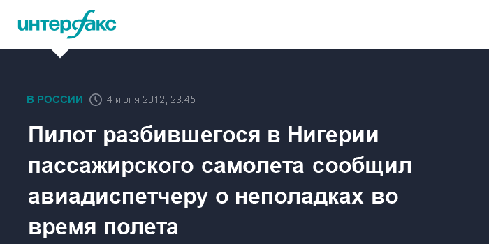 Вашингтон. 4 июня. INTERFAX.RU - Пилот разбившегося в Нигерии пассажирского самолета за несколько минут до крушения сообщил по радиосвязи о неполадках в работе самолета, сообщил в понедельник американский телеканал CNN.