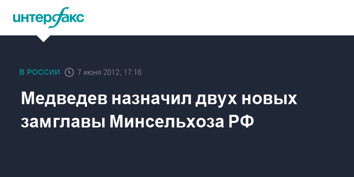 Москва. 7 июня. INTERFAX.RU - Председатель правительства РФ Дмитрий Медведев распоряжением от 6 июня назначил двух новых заместителей министра сельского хозяйства.