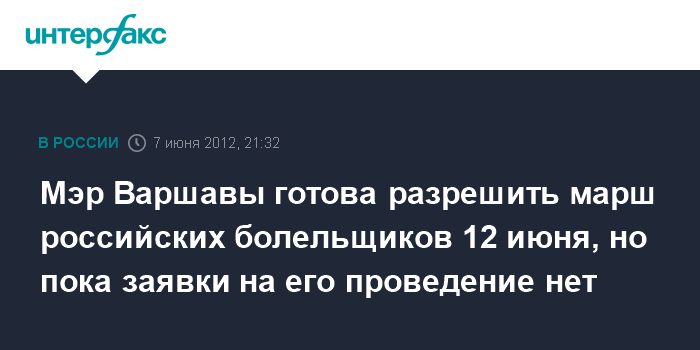 Москва/Варшава. 7 июня. INTERFAX.RU - Администрация Варшавы не собирается отказывать российским болельщикам в проведении марша по улицам города 12 июня, в День России и даты матча с хозяевами Euro-2012.