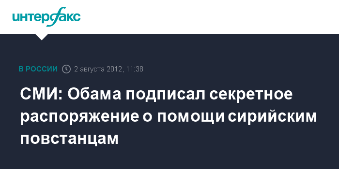 Вашингтон. 2 августа. INTERFAX.RU - Президент США Барак Обама подписал секретное распоряжение, разрешающее оказывать помощь сирийским повстанцам, сообщают в четверг американские СМИ.