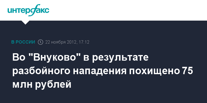 Москва. 22 ноября. INTERFAX.RU - Разбойное нападение с похищением 75 млн рублей совершено в аэропорту "Внуково".