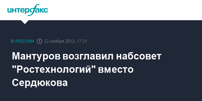 Москва. 22 ноября. INTERFAX.RU - Министр промышленности и торговли РФ Денис Мантуров назначен председателем наблюдательного совета государственной корпорации по содействию разработке, производству и экспорту высокотехнологичной промышленной продукции "Ростехнологии".