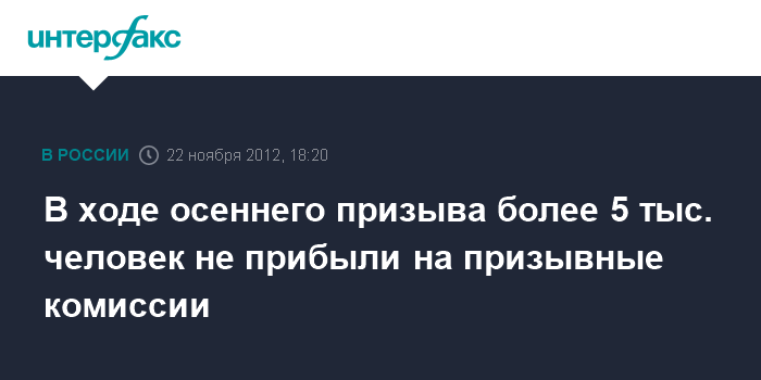 Москва. 22 ноября. INTERFAX.RU - Минобороны РФ готовит материалы для следственных органов на 5300 человек, которые не явились на призывные комиссии без уважительных причин в ходе осеннего призыва в Вооруженные силы, сообщает Управление пресс-службы и информации военного ведомства. "Без уважительных причин на призывные комиссии не прибыло 5300 человек. Соответствующие материалы на них готовятся призывными комиссиями к передаче в следственные органы", - говорится в сообщении, поступившем в "интерфакс-АВН" в четверг.