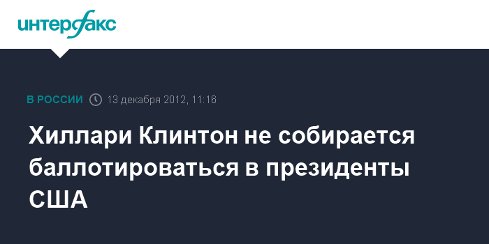 Вашингтон. 13 декабря. INTERFAX.RU - Госсекретарь США Хиллари Клинтон во время интервью телеканалу ABC подтвердила, что не намерена принимать участие в президентских выборах в США в 2016 году.