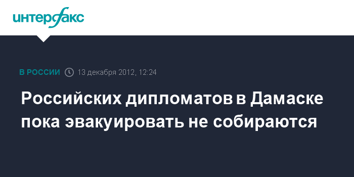 Москва/Дамаск. 13 декабря. INTERFAX.RU - Вопрос о срочной эвакуации персонала российской дипмиссии и других граждан РФ из Сирии пока не стоит, заявляет пресс-атташе российского посольства в Дамаске Сергей Марков.
