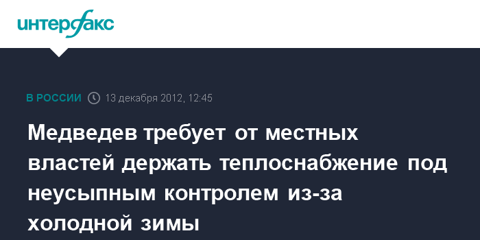 Москва. 13 декабря. INTERFAX.RU - Зима предстоит суровая, местным властям нужно держать теплоснабжение под неусыпным контролем, заявил премьер РФ Дмитрий Медведев.