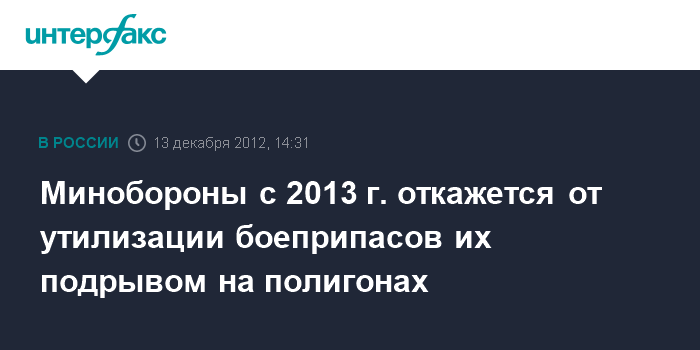 "В 2013 г. утилизация боеприпасов будет происходить только промышленным способом. Ни один военнослужащий ни на одном полигоне заниматься подрывом боеприпасов не будет", - сказал Булгаков.