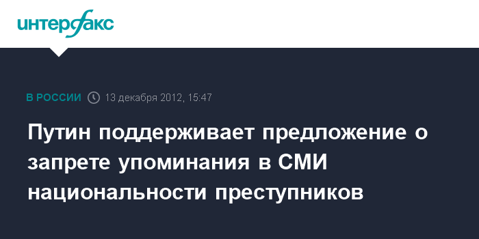 Москва. 13 декабря. INTERFAX.RU - Президент России Владимир Путин заявил, что поддерживает законодательную инициативу о запрете упоминания в средствах массовой информации национальности преступников под угрозой санкций вплоть до закрытия СМИ.